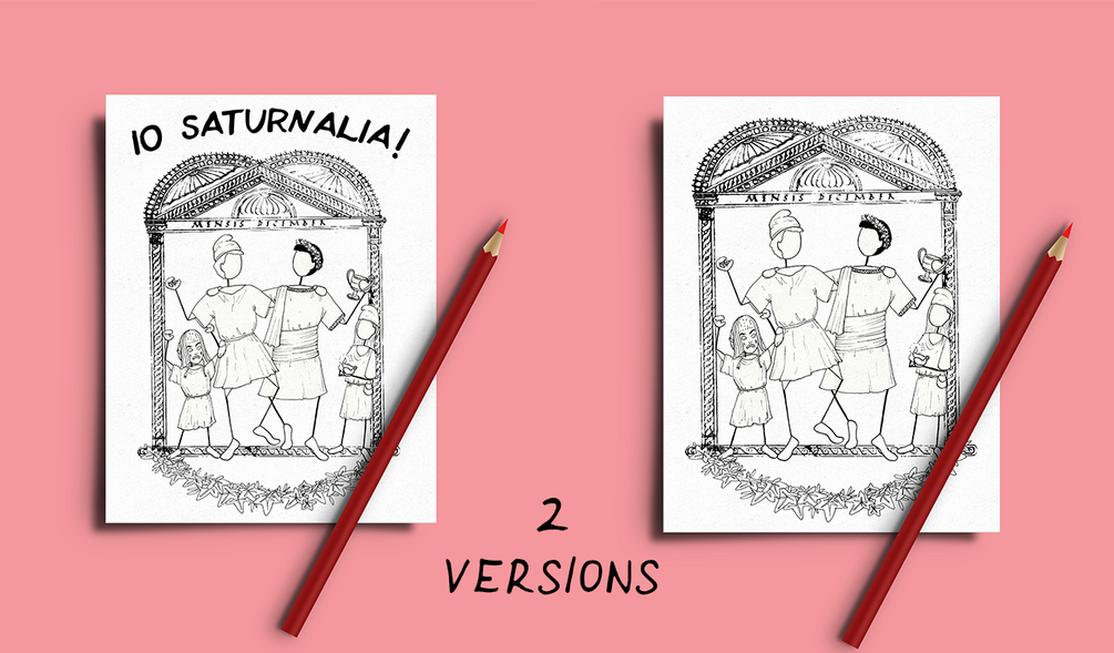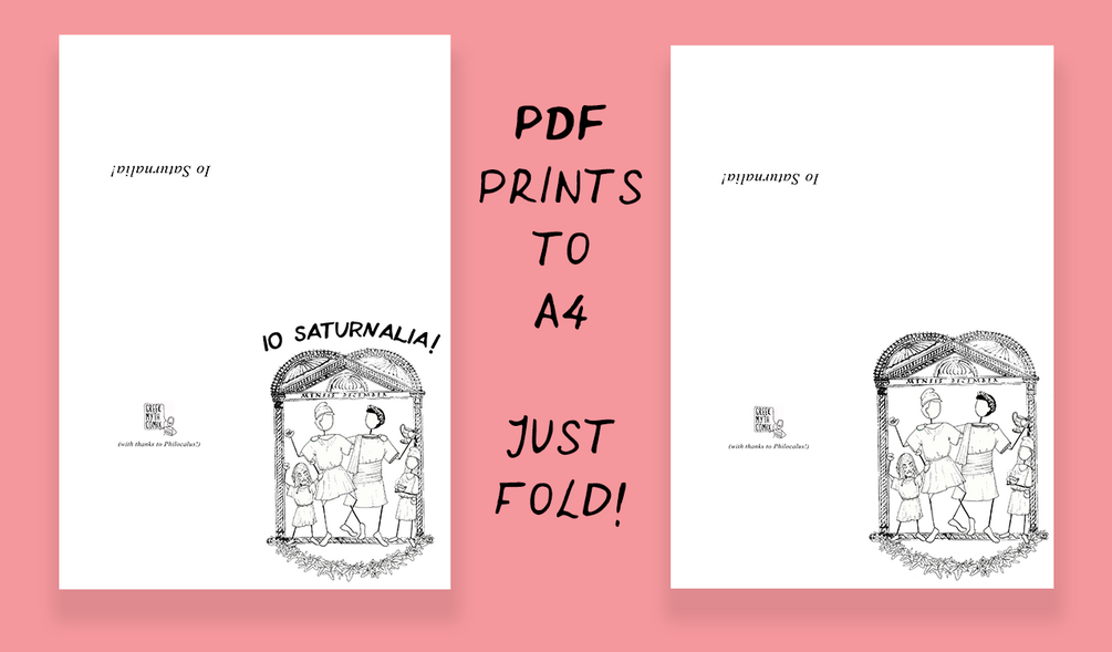 Pass on your proper Saturnalia greetings with these festive cards! Featuring an original GMC design of happy Saturnalia revellers against the entry for December from the 'Chronography of 354' by Philocalus, these line-drawing cards are ready to print, fold, colour and send! Perfect for expressing your own colour preferences or for using with children or pupils in the classroom!