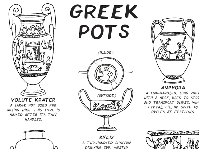 This is an original hand-drawn comic diagram by greekmythcomix artist LEJ. It has been scanned in and edited in Photoshop, and depicts the most popular ancient Greek pots and what they were used for. Originally from the Olympian Gods Colouring Book (also available in download and book on this site).