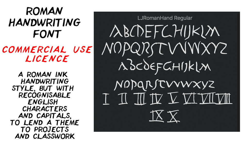 The font was developed specifically to give a Roman theme to projects. It is based on examples of Roman ink handwriting on papyrus over several centuries, however the letters have purposely been made to look more recognisable for ease of use. To create variety and give a more realistic 'handwritten' sense, a set of upper-case letters is also included for mixing in with the lower-case letters (the Romans did not really use upper and lower case when writing). There are also a set of numbers and punctuation points included for full functionality.